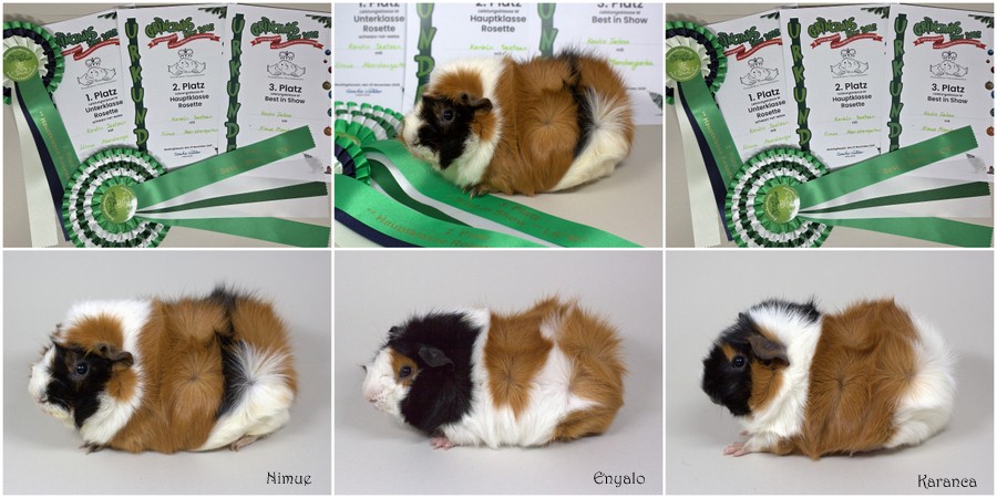 Dieses Wochenende fand die Schau der IG Münsterland auf der Kleintierschau Lingen statt. Es war war super schönes Wochenende und ich kann sehr zufrieden mir meinen Tieren sein. Die UK Rosetten in Schildpatt-Weiß: 3. Platz Queen Mary; 2. Platz Fjella und 1. Platz Taiga sowie für Taiga den 3. Platz in der OK Rosette. Maja el Niño in Rot-Weiß erreichte in UK Rosette gemischt den zweiten Platz. Taiga erhielt von Antje Meyer ein "V" in der Bewertung für ihre Nasenrosetten. Alle vier Tiere erhielten 95,5 Punkte und das Prädikat SG+